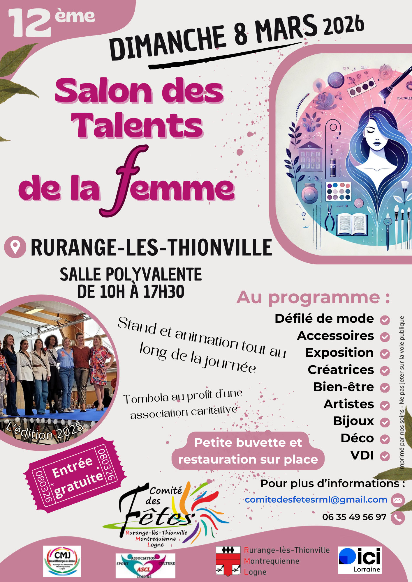 Le Comité des Fêtes de Rurange-lès-Thionville est heureux de vous retrouver en mars 2026 pour sa douzième édition du Salon des Talents de la Femme en partenariat avec la municipalité et le Conseil Municipale des Jeunes.