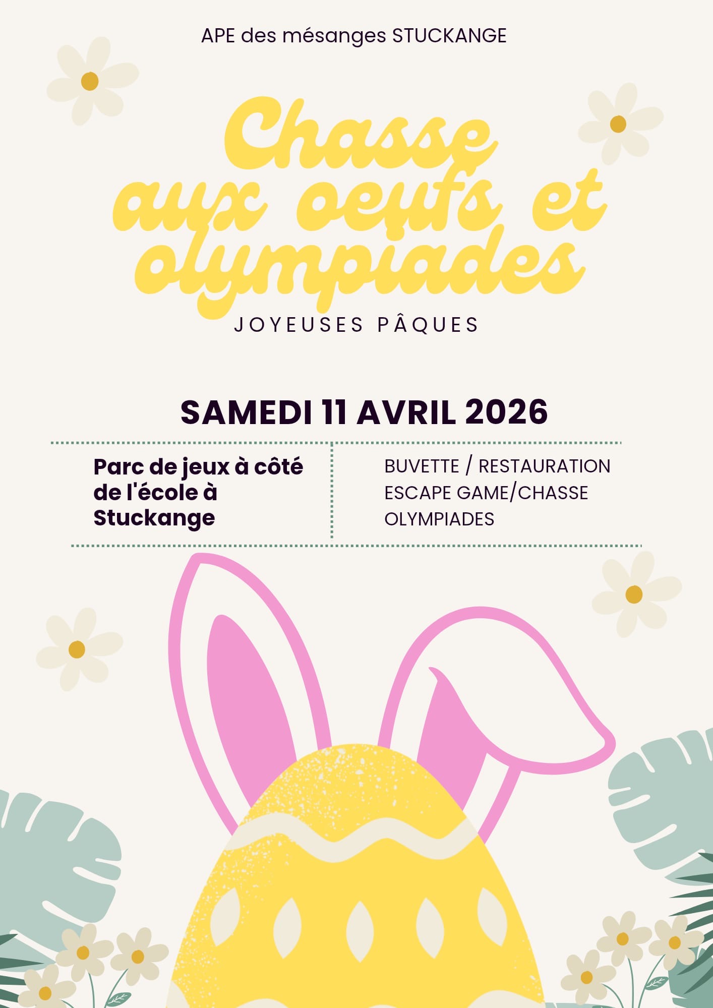 L'APE des Mésanges de Stuckange organise le samedi 11 avril un après midi festif de 14h à 17h30 dans le parc du village à côté de l'école. Au programme pour les - de 3 ans activtié à la recherche des poussins perdus dans le parc (prévoir un petit panier, chaussures et des vêtements adaptés). Pour les plus grands nous proposons un jeu d'énigmes (départ sous le kiosque du parc avant de démarrer). Pour tous ateliers sportifs dans le city stade : course en sac, lancers de sacs etc. Prévoir une tenue décontractée.